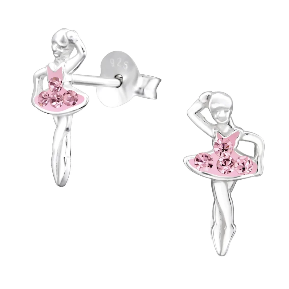 These beautiful stud earrings are crafted of sterling silver and feature ballerinas with glittering pink crystals. Posts secure with push back clasps.