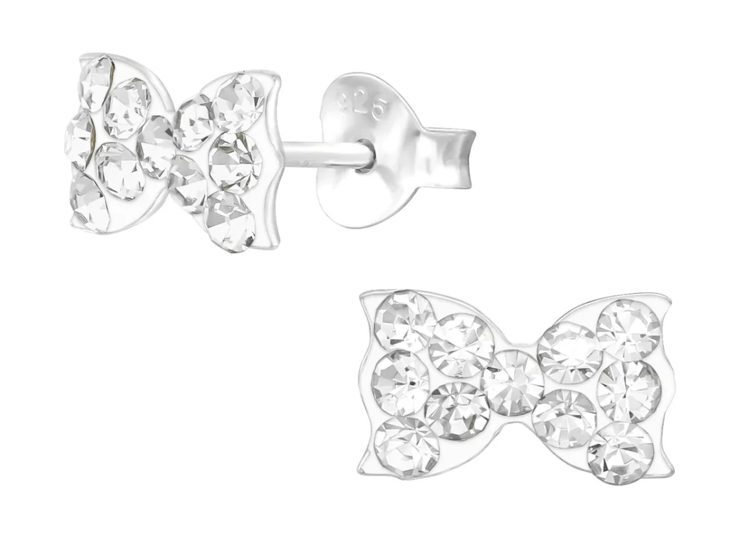 These beautiful stud earrings are crafted of sterling silver and feature bows glittering white crystals. Posts secure with push back clasps.