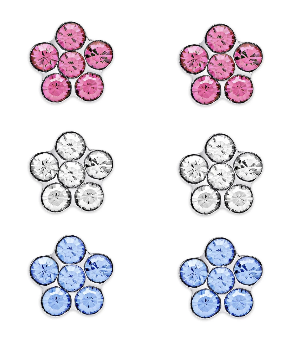 This beautiful 3-pair stud set is crafted of sterling silver and shines with a high-polish finish. Set includes a pair of pink, white, and blue crystal flower studs. Earrings secure with friction back clasps.