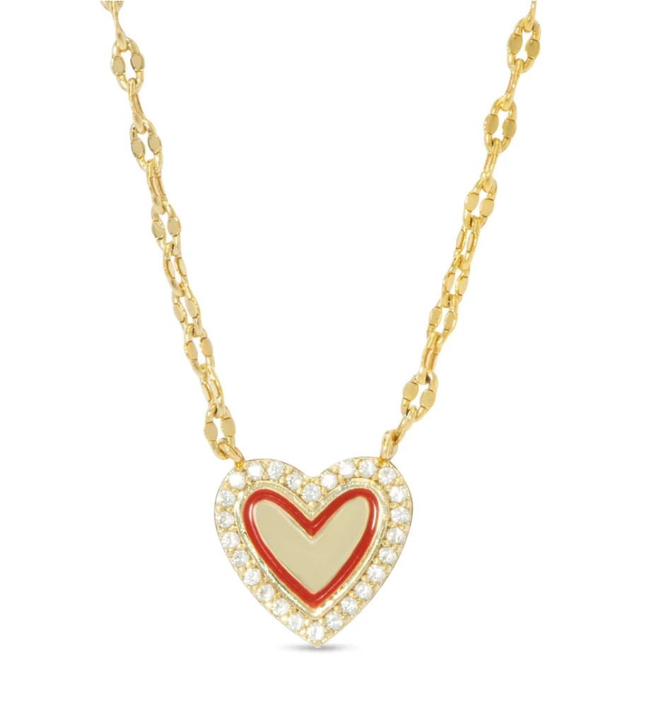 This gorgeous necklace for girls features a heart with a red enamel outline and is surrounded by sparkling CZ gemstones. Chain is adjustable 14″ – 16″ and secures with lobster clasp.