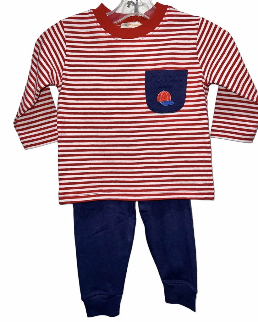 Red Stripe Long Sleeve tee with Navy Pocket with Baseball Cap.