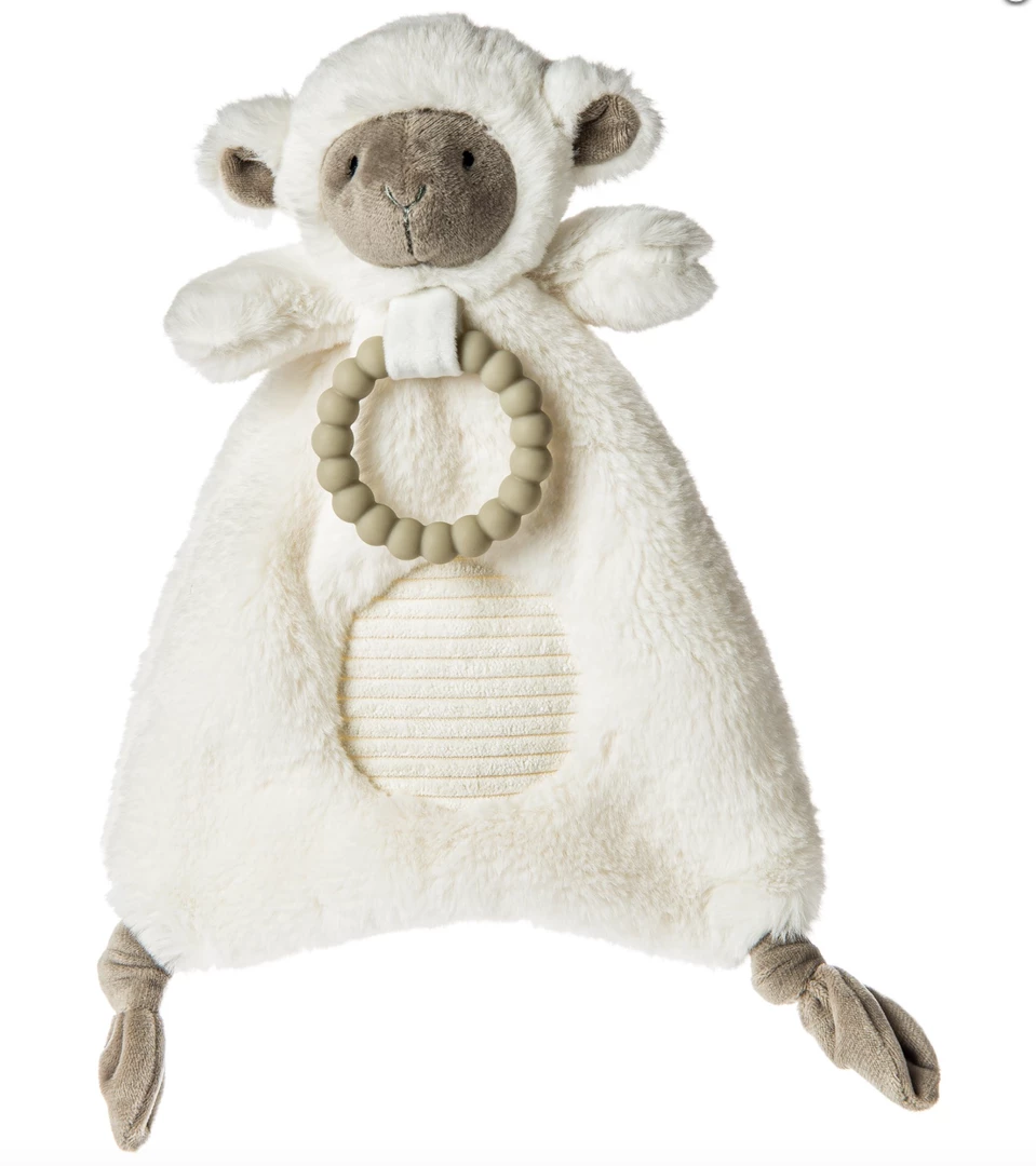 Knotted legs, wide wale tummy, and a silicone teether are featured on on our Lovey with stuffed head and under stuffed body.
