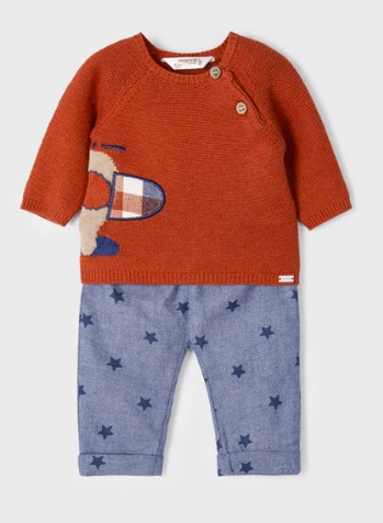 Rust Airplane Sweater with Star Pants.
