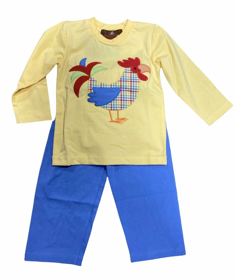Pale Yellow Long Sleeve Tee trimmed in Blue with Plaid Rooster Applique.