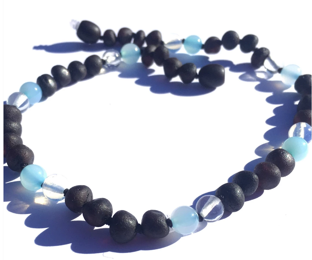 Stunning blue AMAZONITE surrounded by DARK CHERRY BALTIC AMBER and CLEAR QUARTZ gemstones.