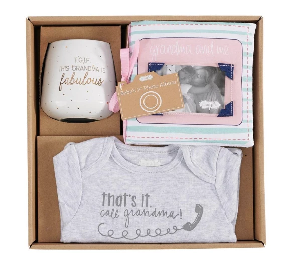 The set includes a gray crawler that reads “that’s it, call grandma”. It also includes a mug that reads “T.G.I.F – this grandma is fabulous”. Share all the memories of grandma in our “Grandma and me” photo book.ย