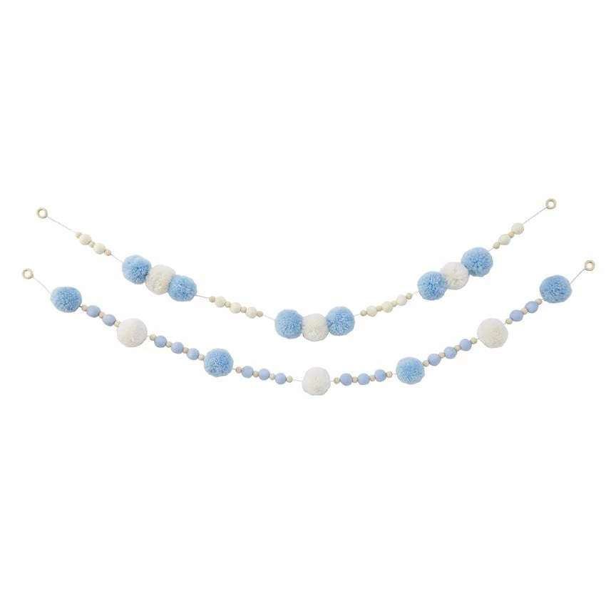 Large acrylic pom-pom garland on cotton cording features wooden and boiled wool beads.
