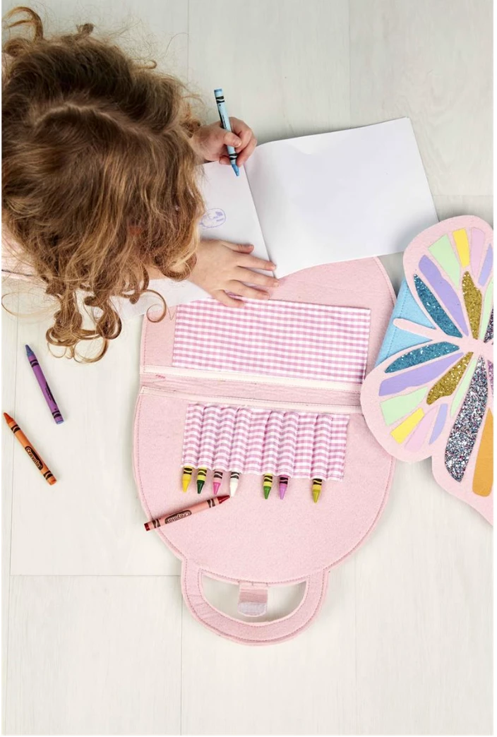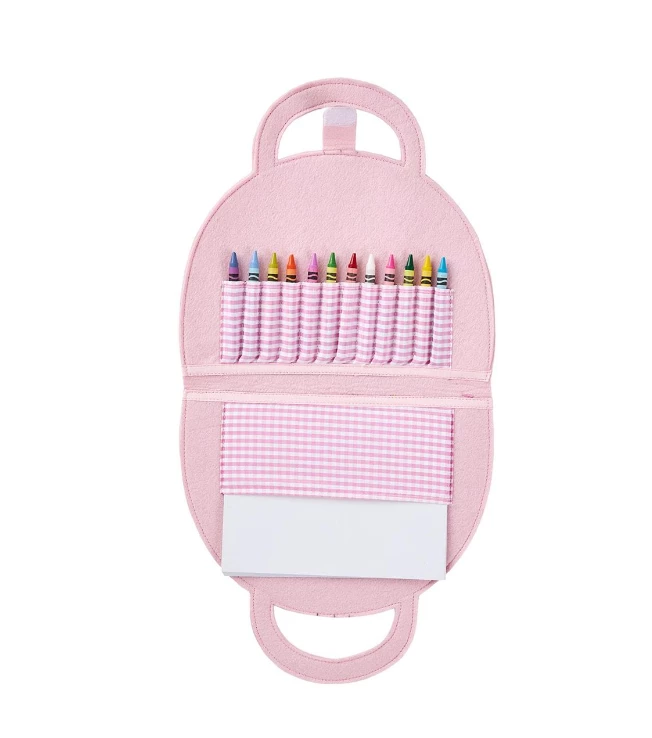 Felt portfolio includes drawing pad and 10 crayons.
