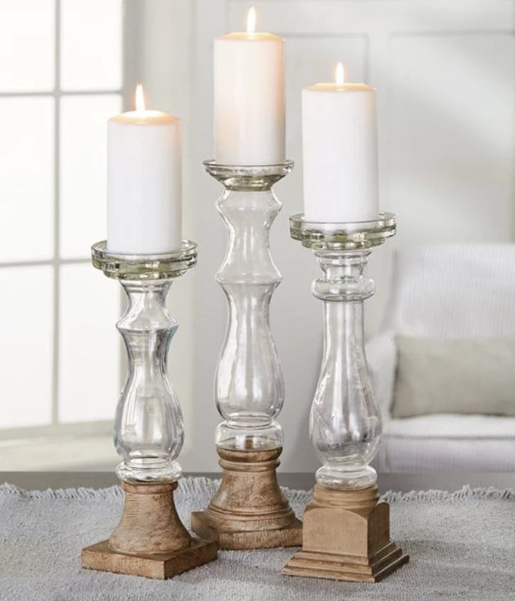 Clear glass candlestick features turned mango wood base. Candles not included.