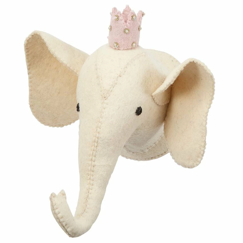Let dreams soar with this hand-crafted boiled wool elephant wall mount, featuring a princess crown adorned with sequins. This darling mini whimsical dΓ©cor piece is ideal for your little girlβs nursery, and arrives with hanging hardware. Due to the handmade nature of this style, slight variations may occur. 11×12
