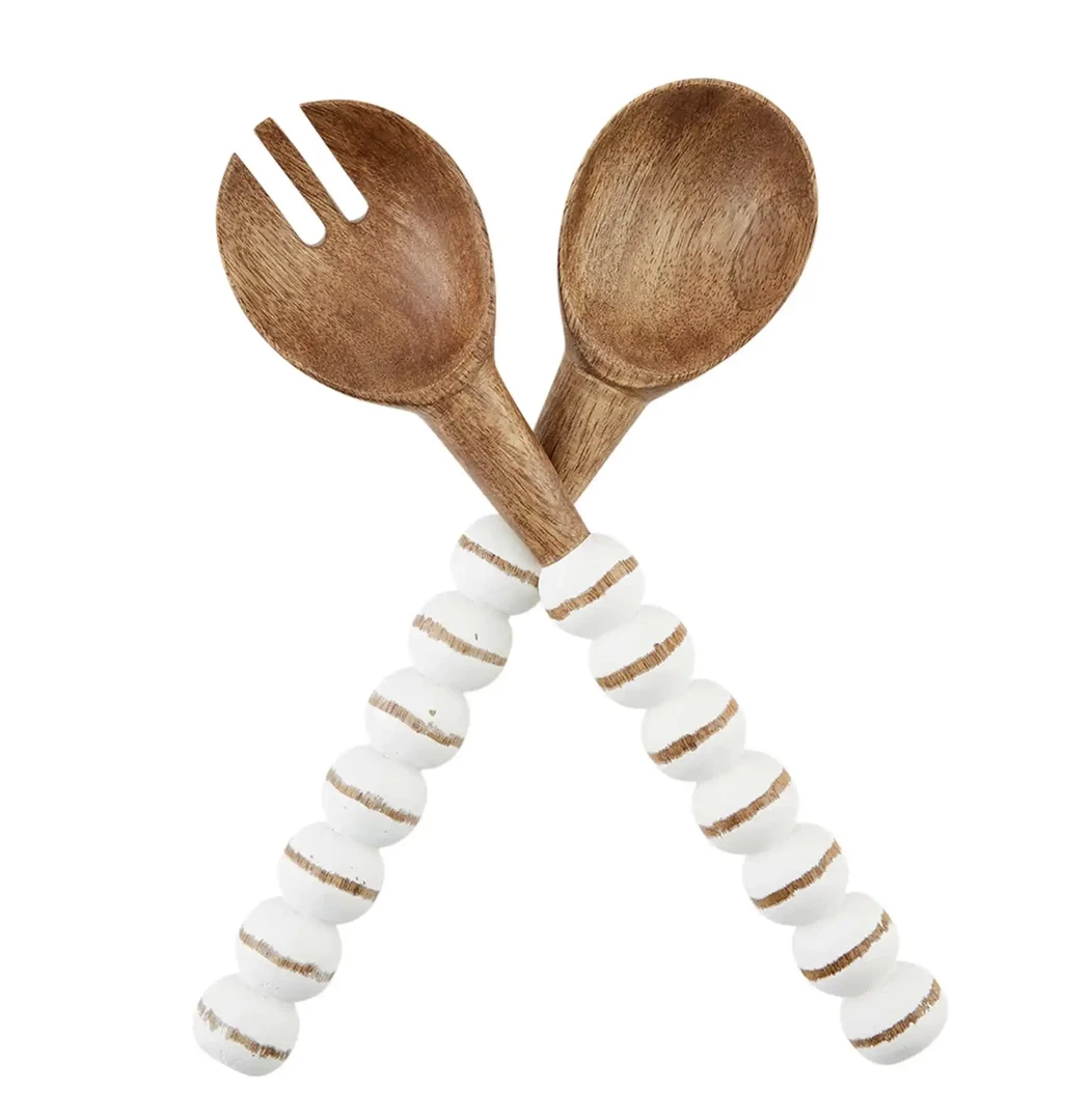 This wood beaded serving utensil set is a great addition to your kitchen. This set comes with two wood serving utensils with beaded handles. The serving utensil features a brown top. The utensil features a white beaded handle. This set comes with a fork and spoon for serving. This set may feature unique colorings and markings.