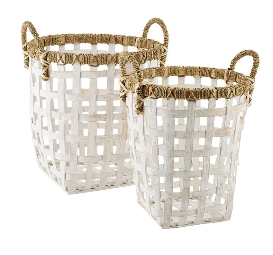 Nested set of two white-washed bamboo baskets feature seagrass wrapped rims and side handles.