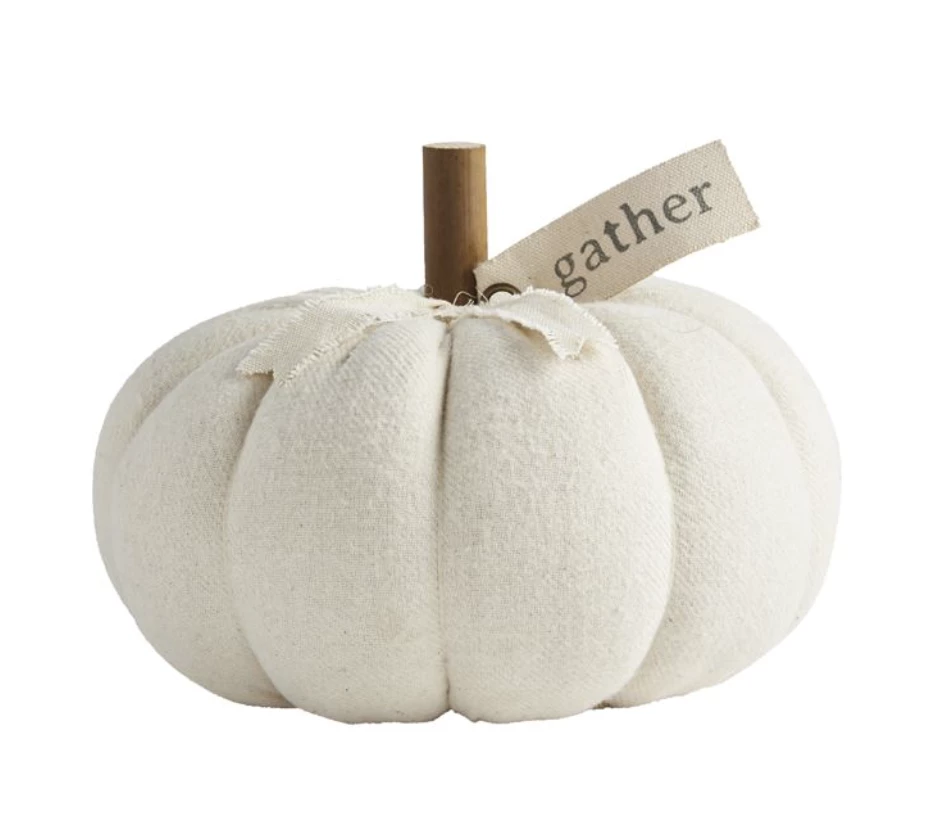 Stuffed cotton pumpkin with wood stem and canvas tag, “GATHER”