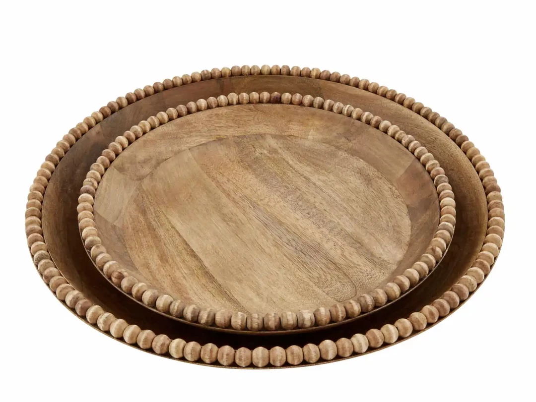 Our wood beaded bowl set is the perfect serving basic. The set comes with a nested set of two mango wood serving bowls. The serving bowls each feature beaded rim details. The set comes with two bowls – one small and one large. The smaller bowl rests perfectly inside the larger bowl for easy storage.