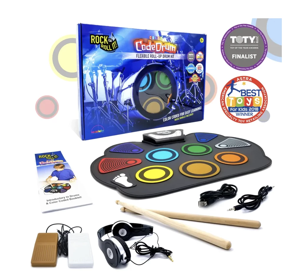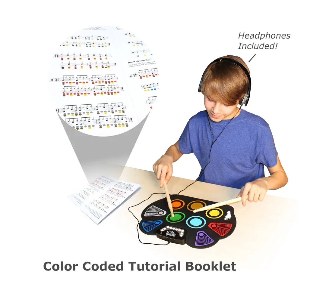 - LEARN TO PLAY THE DRUMS: Perfect for beginners- rock out then roll it up! Color coded set using a spectrum of color makes it easy to learn with included Music Book.