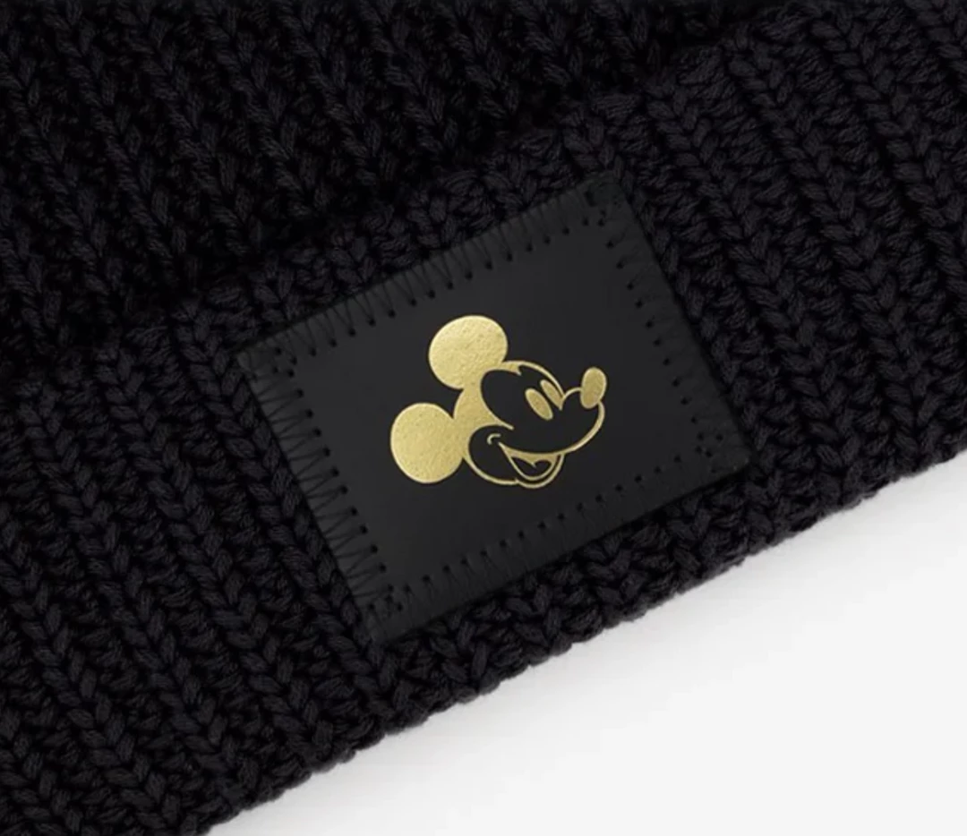 You will be styling from ear to ear when you top off your look with this black cuffed double pom beanie. This glamorous beanie celebrates the classic Mickey Mouse outline icon in gold foil on black genuine leather and features two detachable black faux fur pom ears.