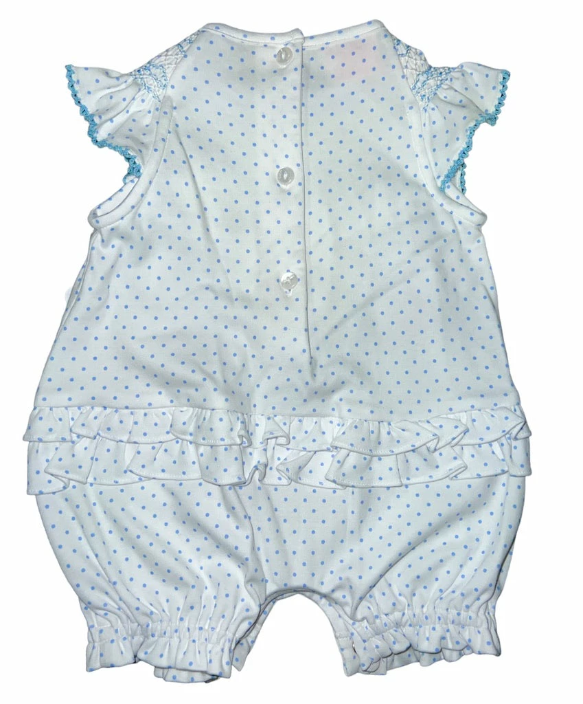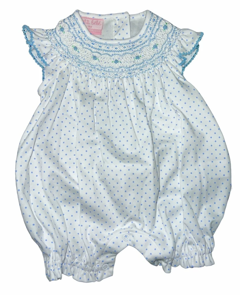 Petit Bebe Smocked Blue Dot Bubble with Flower Smock.