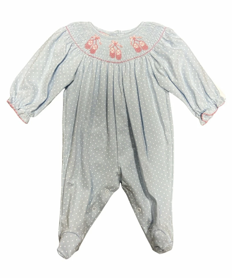 Light Blue with White Dots Footie. Features Smocked Ballet Slippers.