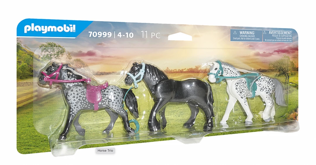 Expand your horse farm with the Horse Trio – a Knabstrupper, Friesian and Andalusian. These majestic animals come with different-colored halters and saddles. The Friesian can be ridden without a saddle. Play with this set on its own or add it to the rest of the PLAYMOBIL Riding Lessons theme (#70995-71000 – each sold separately) for even more horse play! Set includes three horses, three halters and two saddles.