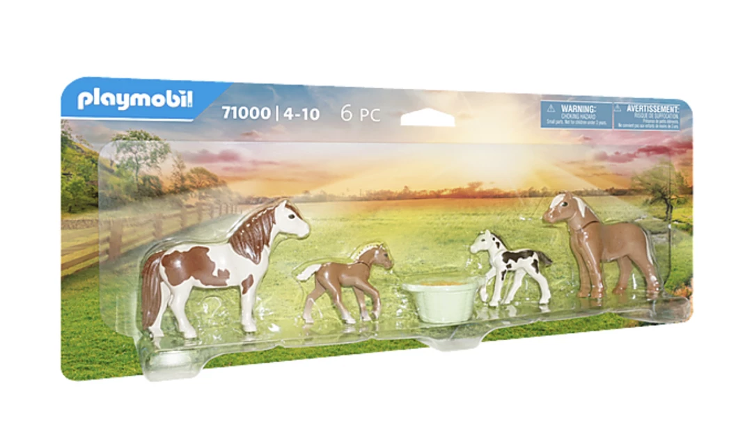 Animals: 2 ponies, 2 pony foals; Accessories: 1 food basket.