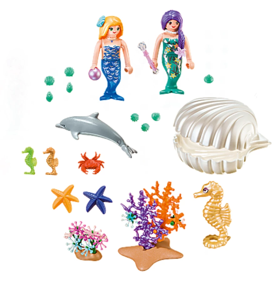 Figures: 2 mermaids; Animals: 1 dolphin, 2 small sea horses, 1 large sea horse, 1 crab, 2 starfish; Accessories: 1 carry case, 8 shells, 1 ball, 1 sceptre, 1 large shell, 1 coral, 1 underwater flower.