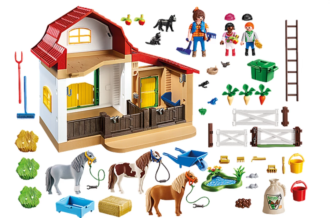 Time to saddle up for some fun down at the Pony Farm. Thereβs so much to do here! This farm has a two-story barn to house your ponies with spacious stalls and attached feeders for afternoon munching. Climb the ladder inside the barn for easy access to the hayloft. Here, you can store feed, straw, and supplies for the ponies and might even catch a barn cat napping. Let the ponies out to play in the large fenced-in paddock. Donβt forget to groom the ponies to make their coat shine. Clean-up in the barn is simple with the included pitchfork, broom, and wheelbarrow. Set includes three figures, three ponies, two-level barn, adjustable fence, drinking pond, two cats, and lots of other accessories.