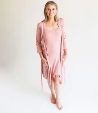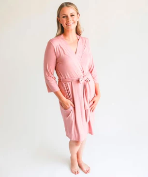 Delivery/nursing maternity robesΒ will make your visit during and after the hospital comfortable and stylish. This robe is bump-and-beyond and transitional through all the stages of motherhood. Stylish and feminine our robes are lightweight and breathable.Β