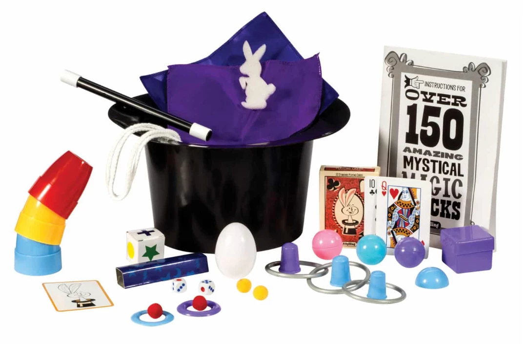 The Deluxe 150 Magic Hat Set includes a wearable Magic Hat and is packed full of many magicianβs favorites, like Mystic Cards, Magic Dice, Magic Rope, Levitating Wand, Magic Cloth and much, much more.