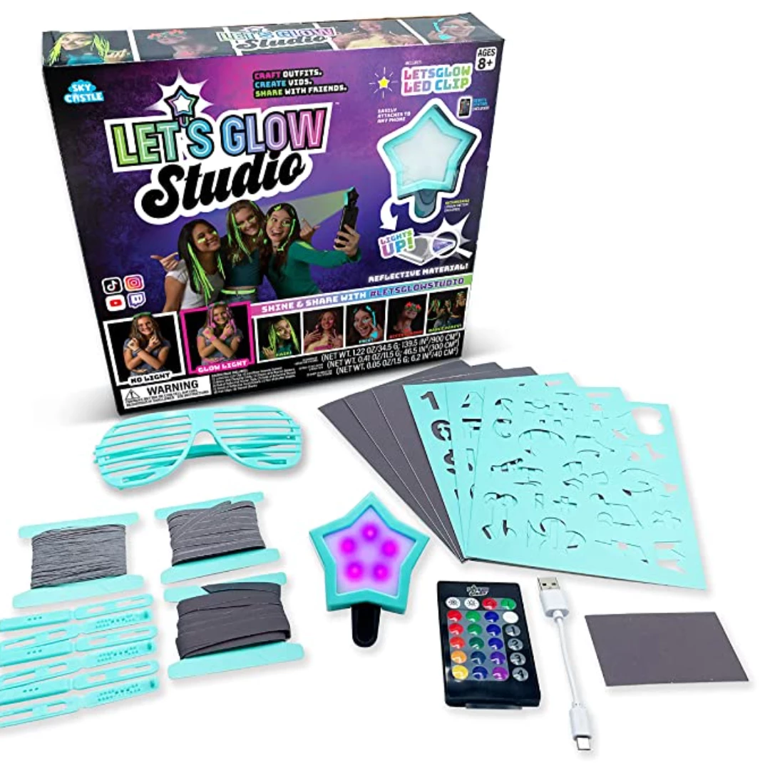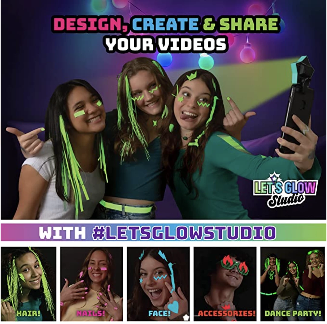 - GLOW UP YOUR WHOLE PARTY: LetsGlow Studio includes enough crafting accessories for hours of play and lots of different outfits! Included is the LetsGlow Selfie LED Clip with remote and charging cable, three non-toxic reflective sticker sheets with stencils, ten reflective nail stickers, 10+ ft of non-toxic reflective sticker tape, 55+ ft of double-sided re-usable reflective material with hair clips and a pair of shutter shades for custom reflective decoration to dazzle your videos!