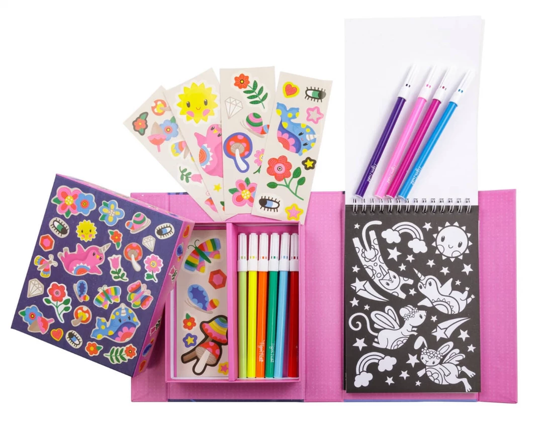 Find a little magic in playtime with this Magic Creatures Coloring Set. Dive into a world of mernicorns (thatβs a mermaid-unicorn!), rainbow-colored kittens, and even flying puppies! Packed with activities, colored markers, and stickers, this set is sure to captivate your little one with all of the possibilities. This premium kit is designed for portable play, packaged in a sturdy, compact magnetic sealed box. Perfect to keep the little ones engaged while in the car, at a cafe, or when they have some quiet time at home. Tiger Tribe is a leader in cultivating endless, creative fun for kids everywhere. Keeping little ones busy is not easy, and giving them ways to explore their imagination and make something meaningful is important. Tiger Tribe products are thoughtfully designed and are meant to keep kidβs minds engaged and open to loads of creative play!