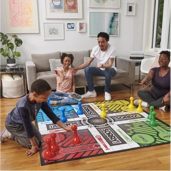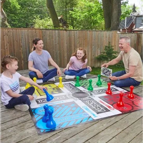 Ditch the TV, and rekindle with family game night with a classic board game. Slide, collide and score to win the Sorry! Game. In this giant edition, spin the wheel to see how far you get to move one of the pawns on the board. If they land on a Slide they can zip to the end and bump their opponents’ pawns โ or their own. Jump over pawns and hide in the Safety zone where opponents can’t go. Kids keep on moving and bumping until they get all three of their pawns from start to home. But watch out, because if the pawn gets bumped, Sorry! It’s back to start! Sorry! This extra-large game features a 64โl x 64โw illustrated vinyl gameboard perfect for indoor or outdoor gameplay.