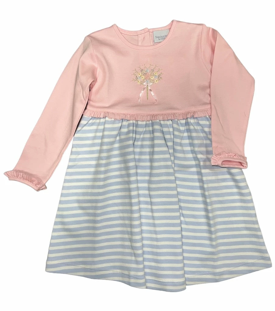 Pink/Blue Stripe Squiggles dress with Flower Bouquet.