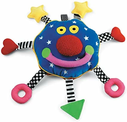 - Developmental features include rattles, squeakers, crinkle paper, grasping loops, and a hidden self-discovery mirror under the bid red nose