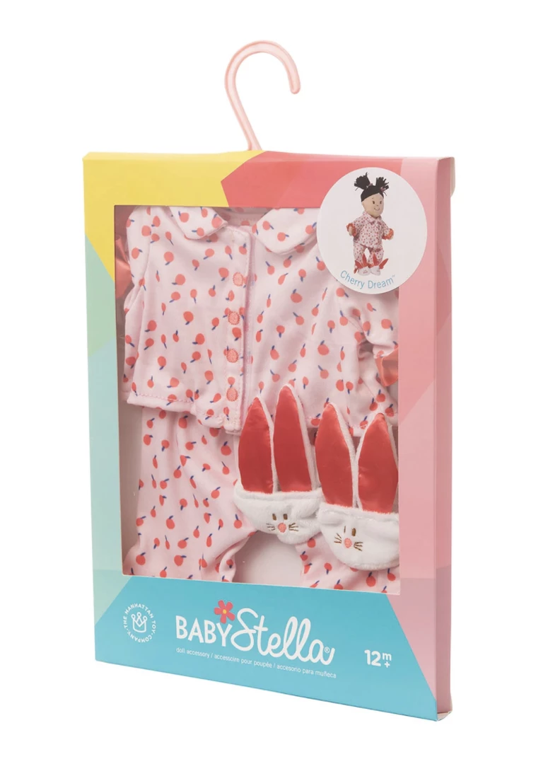 The Cherry Dream 3-piece pajama set from the Baby Stella collection features a matching top and bottom along with bunny ear slippers. This doll clothing set will fit all 15″ Baby Stella dolls, with closures for little hands to easily change.รย