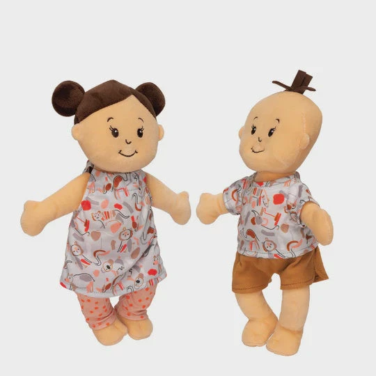 It’s a boy!…and a girl! This Wee Baby Twins Set features 2 dolls that are twins dressed in neutral outfits. Includes 2 ultra-soft 12 inch dolls with cute, embroidered facial features and plump tummies. Girl twin has brown hair buns and boy twin has a brown tuft of fleece hair. Removable clothing and magnetic pacifiers encourage role play in little ones.