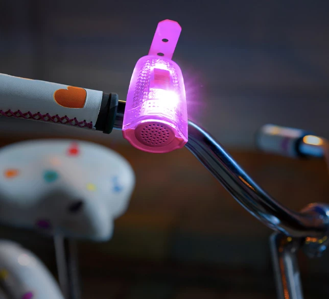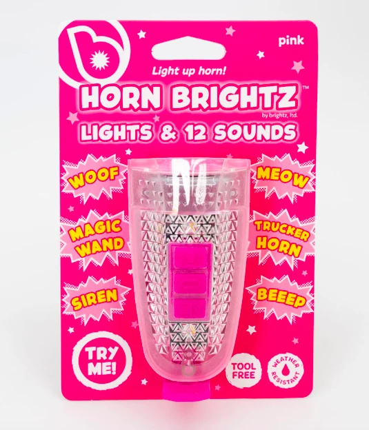 Nothing says βComing through!β like a light-up bike horn packed with 12 fun sounds! Choose from a honk, moo, traditional bell ring, and more, then turn on the lights and ride!