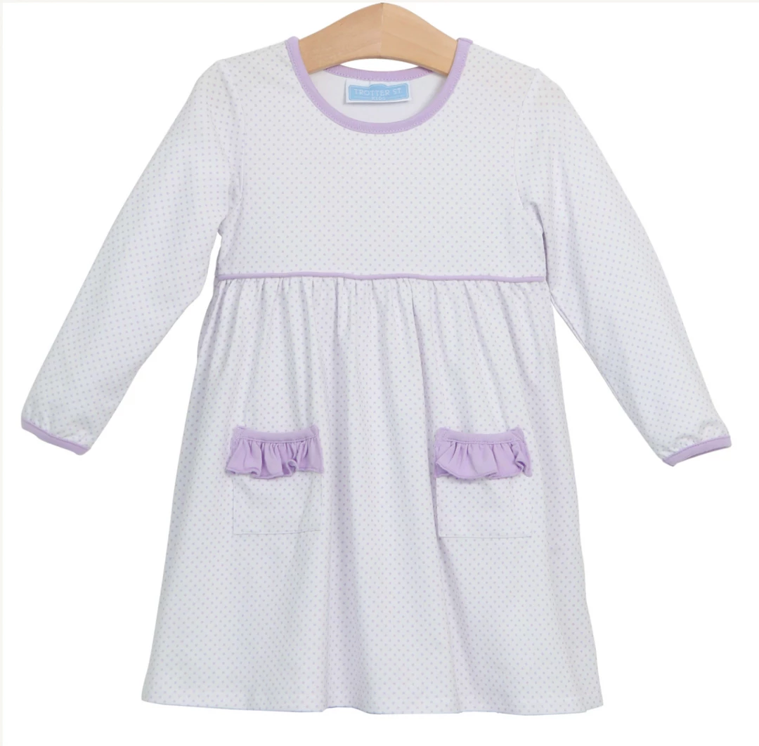Lavender Dot Dress with Purple Ruffle Accent Pockets.